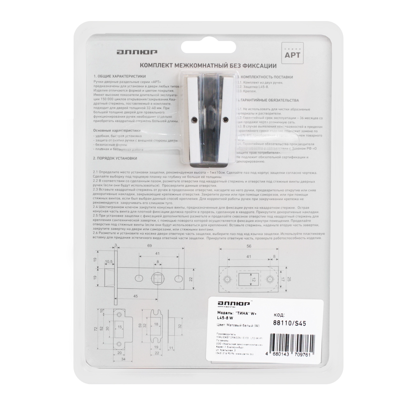 Защелка межкомн. АЛЛЮР "ТИНА" РУЧКА БЕЛЫЙ МАТОВЫЙ /15721/